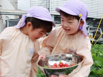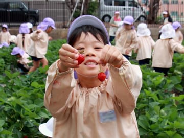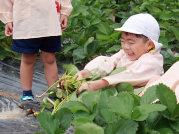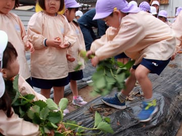 5月26日(月曜日)年長児がいちご畑の片づけをしました。今年もたくさん収穫できたいちご畑とも今日でお別れ!最後のいちごを収穫後、みんなでいちごの苗を抜き、マルチ留めの抜き取り作業も手際よく手伝い、いちご畑の片づけが完了しました。6月初旬に今度は芋の苗を植えつけます。なかよし農園が芋畑に変身するために頑張った年長組の子ども達でした。