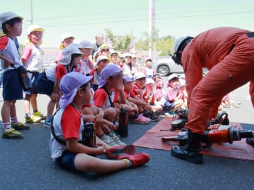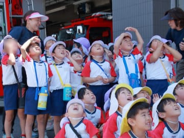 6月5日(木曜日)年長組が消防署見学に行きました。憧れの消防士さんに会えるということで前日からワクワクととても楽しみにしていた子ども達でした。地震、火事(煙)の体験や火事に関するビデオ視聴、消防車とはしご車、訓練の見学とたくさんの経験をさせていただきました。消防士の仕事の大切さや大変さを知った子ども達。消防士さんへの憧れの気持ちがより一層高まったように思いました。津山圏域消防組合の皆さんお忙しい中、貴重な経験をさせていただきありがとうございました。