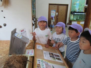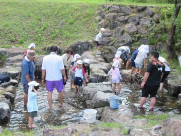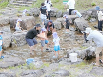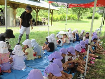 7月23日(水曜日)年長児がお楽しみ会に参加しました。今年はパパクラブ(保護者クラブ)の方のご協力の下、津黒いきものふれあいの里で魚のつかみ取り体験をしました。魚に初めて触れる人もあり、緊張していた様子もありましたが、「ぬるぬるする!」と言いながらも感触も楽しむことができました。つかみ取りの後は魚と焼いていただき「命をいただく」ということを身近に感じることができた良い経験になりました。園に帰ってから昼食を済ませ、もう一つのお楽しみ「きもだめし」もみんなで楽しみ降園しました。夏らしい体験ができ夏の思い出の一つとなりました。ご協力くださったパパクラブの皆さんお忙しい中お世話になりありがとうございました。