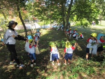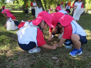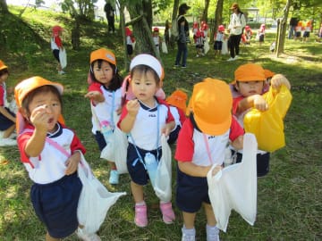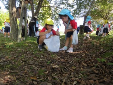 10月10日(金曜日)年少組と年中組がグリーンヒルズに園バスで出かけ、園内を散策しました。大小いろいろな大きさのどんぐりや木の実、色づいた落ち葉などを拾ってとても嬉しそうでした。暑かったのですが、風は爽やかで気持ちよく秋の自然を満喫した一日でした。