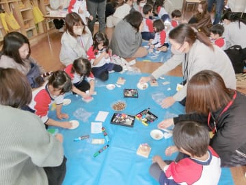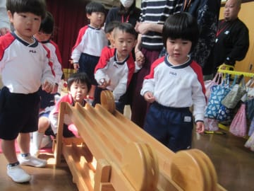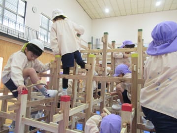 11月5日(水曜日)今年度の木育参観日を行いました。年長組は木製の組立ジャングルジム「くむんだー」に挑戦したり、木片を使ったジオラマ作り、年中組は桧と杉の木を組み合わせ、木のみでトッピングした素敵なケーキ作り、年少組はクリスマスツリー作り。そして年少・年中組は遊戯室にて木のおもちゃでも遊びました。室内には木の良い香りが漂い、親子で木を使った作品作りを楽しむことができました。