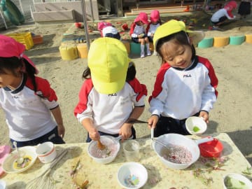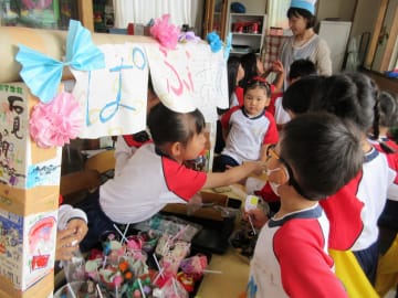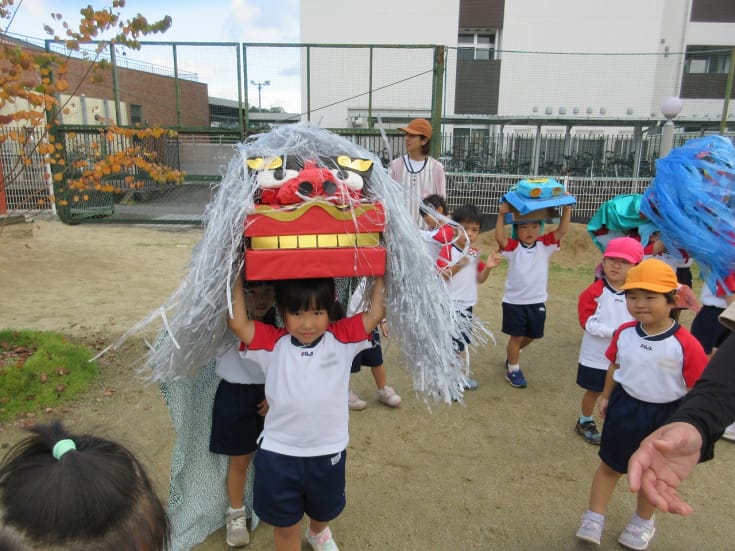 子ども達のこれまでの遊びがもっとわくわくしたものになるしかけや計画がたくさんのわくわくウイーク。獅子舞いや制作物が縁日の遊びにつながり、踊ったり、楽器を鳴らして歩いたり、売り買いのやり取りを楽しんだり、色々なものを作ったり、園外に出かけ秋の自然物もたくさん拾ったり、触れたりすることができました。豊かな遊びが色々な気づきや学びにつながりますように。