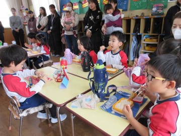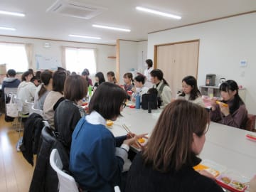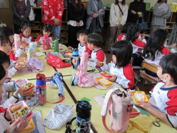 11月26日(水曜日)年中組の給食試食会を行いました。2クラス合同で31名の参加があり、お母さん方の給食に対する関心の高さを感じることができました。まず、各クラスの子ども達が給食を食べる姿を見ていただき、その後、別室にて子ども達と同じ給食を試食してもらいました。本園の管理栄養士より献立の説明があり、当日のコロッケは子ども達が収穫したさつまいもであることに歓声があがっていました。また、素材の味を大切にした味付けや噛み応えのある調理法、小学校の給食に向けて酢を使用している工夫などの話を興味深く聞いておられました。その後はみなさんで茶話会にて親睦を深められたようでした。