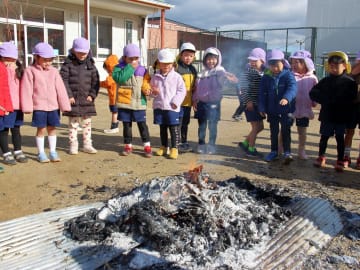 2026年1月7日(水曜日)三学期が始まり、14日(水曜日)に全園児でとんどを行いました。各家庭より持ち寄った正月飾りや書初めが舞い上がり、みんなで今年一年の無病息災を祈りました。