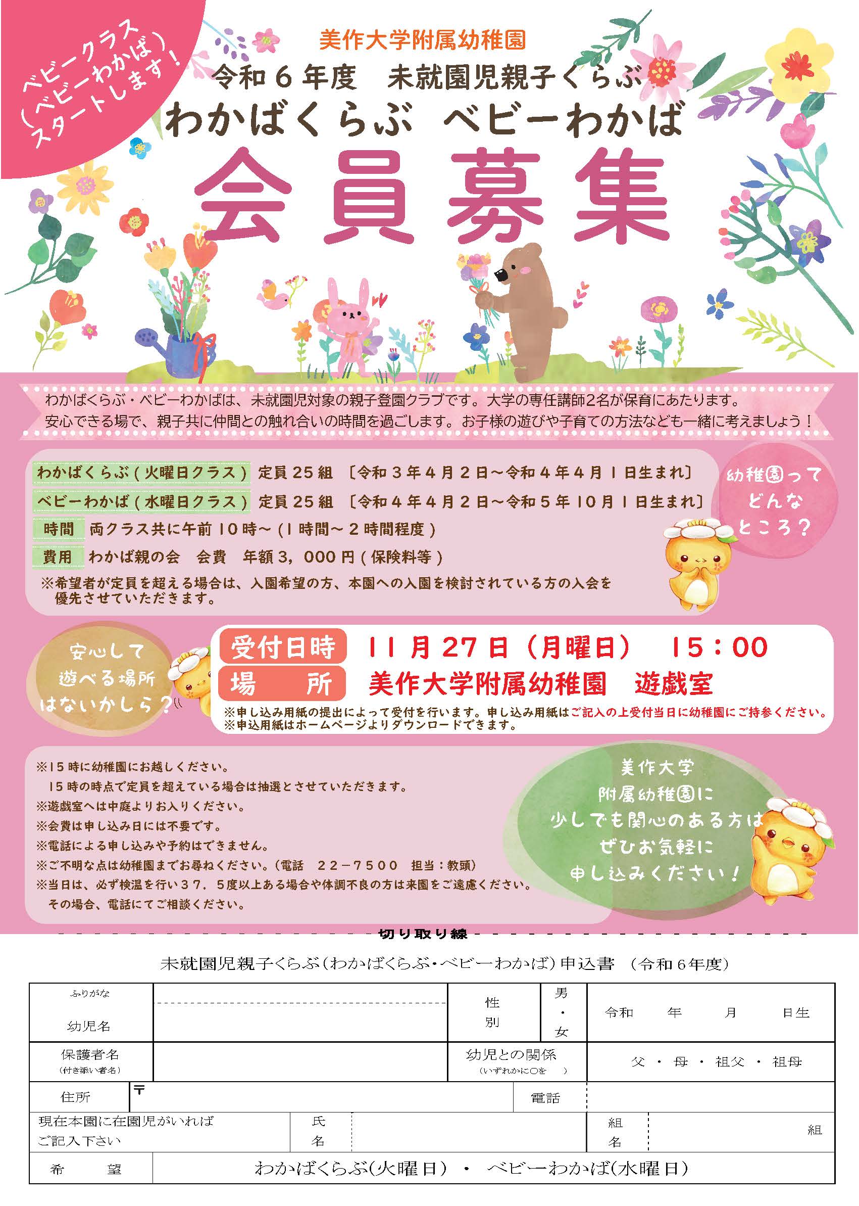 申込日 | 令和6年11月25日(月曜日) 15:00(美作大学附属幼稚園 遊戯室にて) |