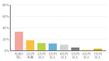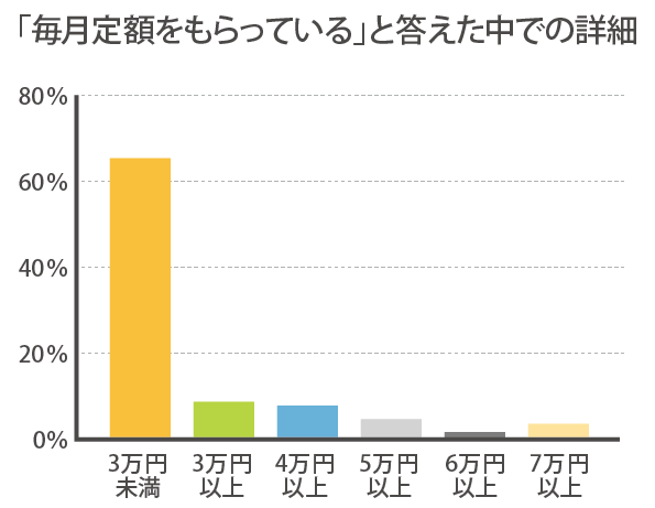 毎月定額の仕送りをもらっている学生の60%以上が3万円未満です。また3人に1人ほどはまったく仕送りをもらっていません。
