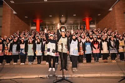 つぎにみんなの心を一つにして「Hey 和」を赤・青・黄・緑の4色のミニ懐中電灯で演出し、合唱しました。そして、ミマッパちゃん(美作学園マスコットキャラクター)のカウントダウンで、約5万5千個のLEDを使った6種類のイルミネーションが一斉に点灯しました。