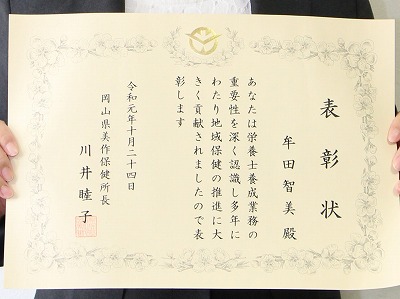 栄養学科牟田智美先生『栄養士養成功労』で表彰されました。